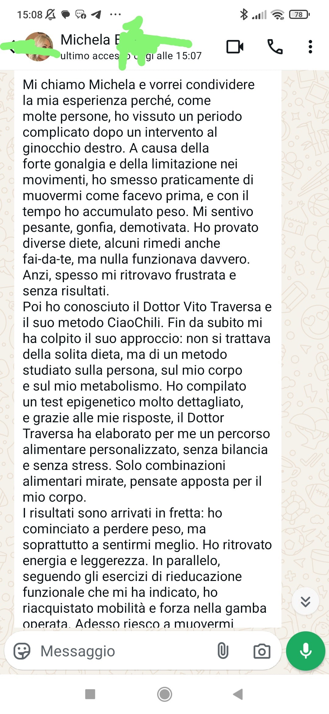 Michela 50 anni, lavora in un bar, è sempre in movimento per il suo lavoro, sempre in piedi, esegue movimenti ripetitivi. Il lavoro in un bar può sembrare poco faticoso, ma portato alla lunga può procuare microlesioni articolari, atrofizzazione muscolare con rigidità della regione lombare e della spalla. Infatti ha subito un intervento al ginocchio destro come effetto riflesso delle cattive distribuzioni dei carichi del corpo causati dalle rigidità acquisite negli anni durante lo svolgimento del suo lavoro. L'approccio nei suoi confronti è stato del tipo motorio, Integrativo e Nutrizionale. Una fase depurativa, attraverso gli Integratori funzionali CIAOCHILI ha permesso di eliminare dalla matrice extracellulare tutte le tossine procurate dall'infiammazione e il giusto apporto nutrizionale personalizzato di apportare i giusti nutrienti che servono per la riparazione e ricostruzione tissutale. in ultimo, l'attività motoria mirata, come recupero funzionale Neuro Attivo, ha ristabilito la normale abilità funzionale dell'articolazione.
