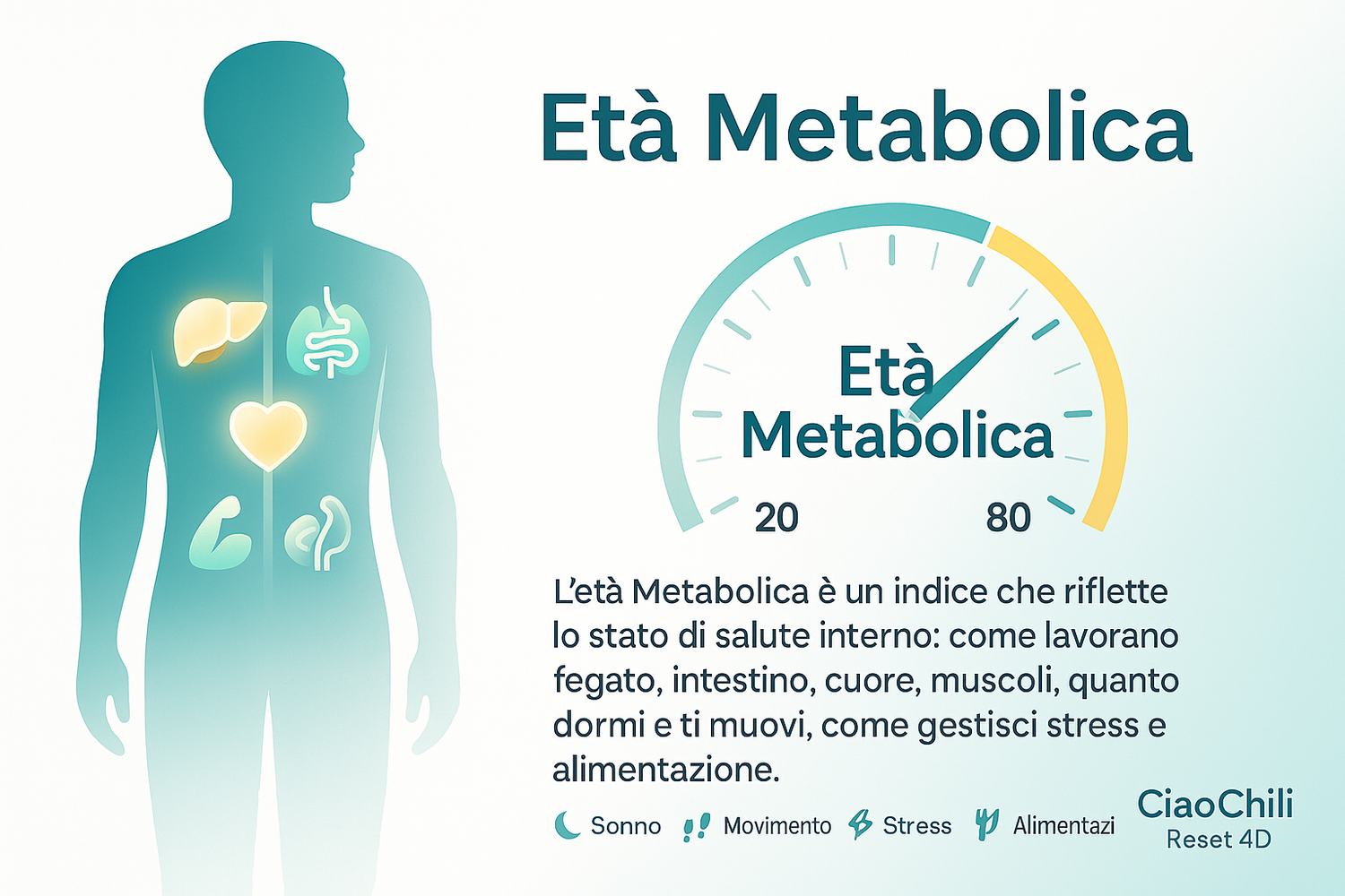 L'età Metabolica è un indice che riflette lo stato di salute interno: come lavorano fegato, intestino, cuore, muscoli, quanto dormi e ti muovi, come gestisci stress e alimentazione.