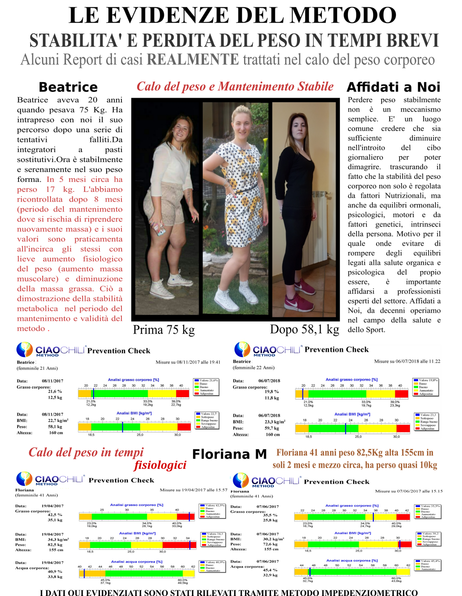 Due casi al limite dell'Obesità, una giovane donna di 20 anni, Beatrice e una quarantenne Flora. Anche se la distanza di 20 anni può sembrare facilmente gestibile , invece, quando i dismetabolismi dipendono da fattori ormonali, si deve agire con metodo, rispettando i tempi fisiologici di un adattamento cellulare per raggiungere un equilibrio stabile, evitando l'effetto yoyo. L'Approccio del metodo CIAOCHILI Reset4D ha previsto per loro un periodo depurativo, per poi cominciare con un percorso Nutrizionale di combinazioni alimentari mirate e Integrativo ciclico. I risultati sono stati visibili in tempi accettabili, rispettando la fisiologia e la stabilità Metabolica. Si è evitato l'effetto yo-yo che è procurato dalle diete rapide, commerciali e incontrollate.